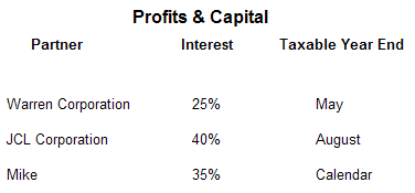 1. Bytes, Ltd is a partnership formed by Warren Corporation, JCL Corporation, and Mike (an individual), to build and repair personal computers. The partners' profits interest in Bytes and their respective taxable year's are stated below. Assuming there is no business purpose for any particular year and no Section 444 election has been made, determine the partnership's required taxable year.