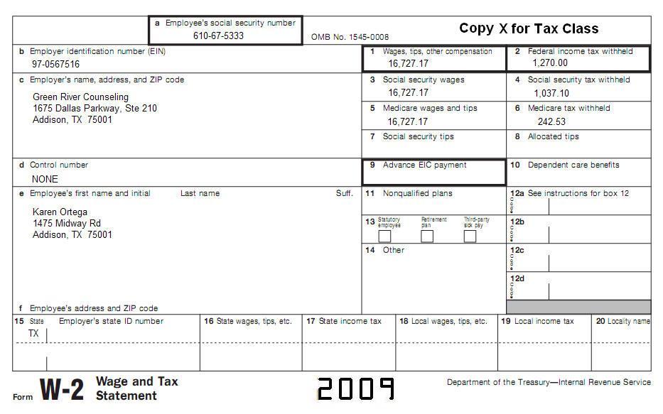 Karen's W-2 shows her current address information.